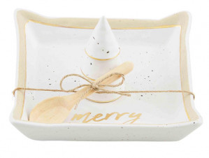 2-piece set. Hand-painted speckle stoneware candy dish with dimensional center tree. Comes with wood spoon. - Additional Information